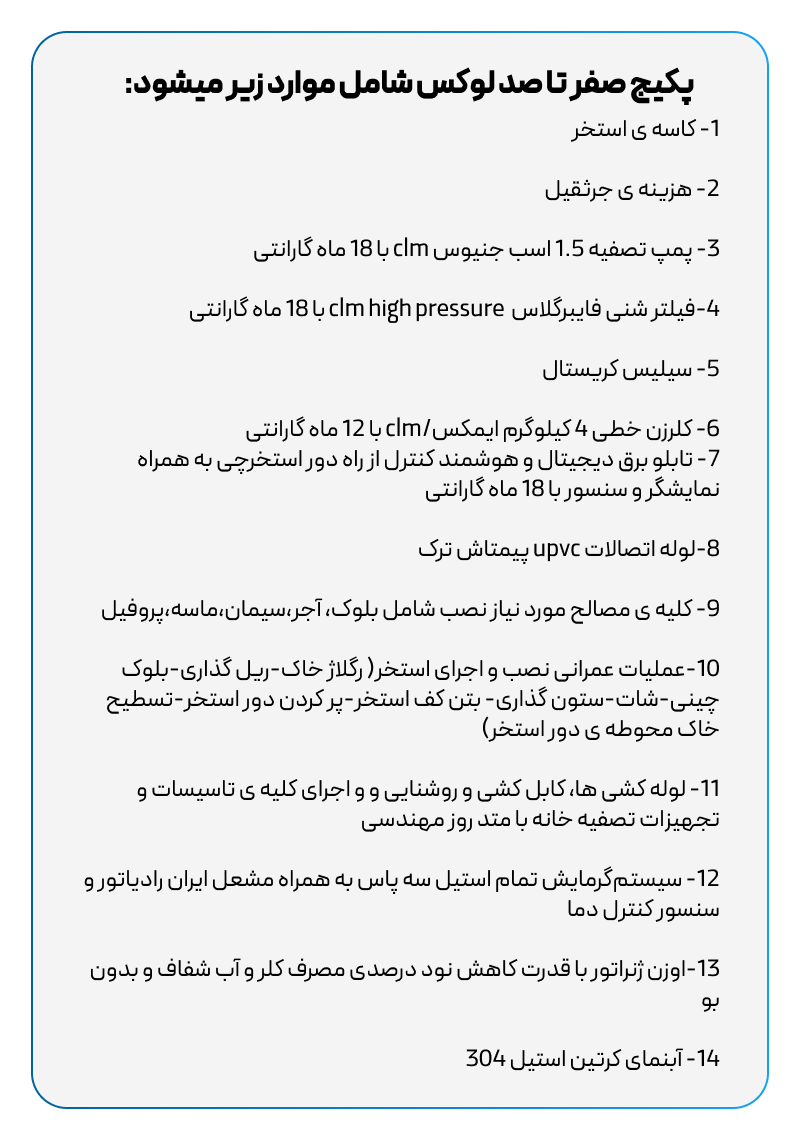 تمام پکیج ها امکان افزودن سیستم گرمایش شامل (دیگ، مشعل، مبدل، اتصالات و نصب) را دارند، بسته به نوع و برند و بودجه کارفرما، پیشنهادها مختلف است.(گالوانیزه، فولادی، نیمه استیل، تمام استیل) گارانتی ۲۴ ماهه استخرچی سیستم گرمایش تمام استیل سه پاس همراه با مشعل ایران رادیاتور و سنسور کنترل دما × × سیستم گرمایش