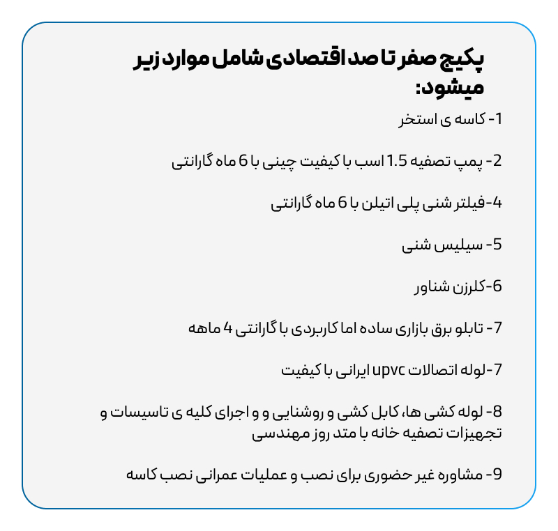 در تمام پکیج ها ار تجهیزات با کیفیت در رنج قیمت مختلف استفاده می شود اقتصادی: ۶ ماه بهینه: ۱۲ ماه لوکس: ۱۸ ماه پمپ استخری جنیوس clm پمپ استخری ۱.۵ اسب clm پمپ با کیفیت معقول چینی به همراه استرینر پمپ تصفیه