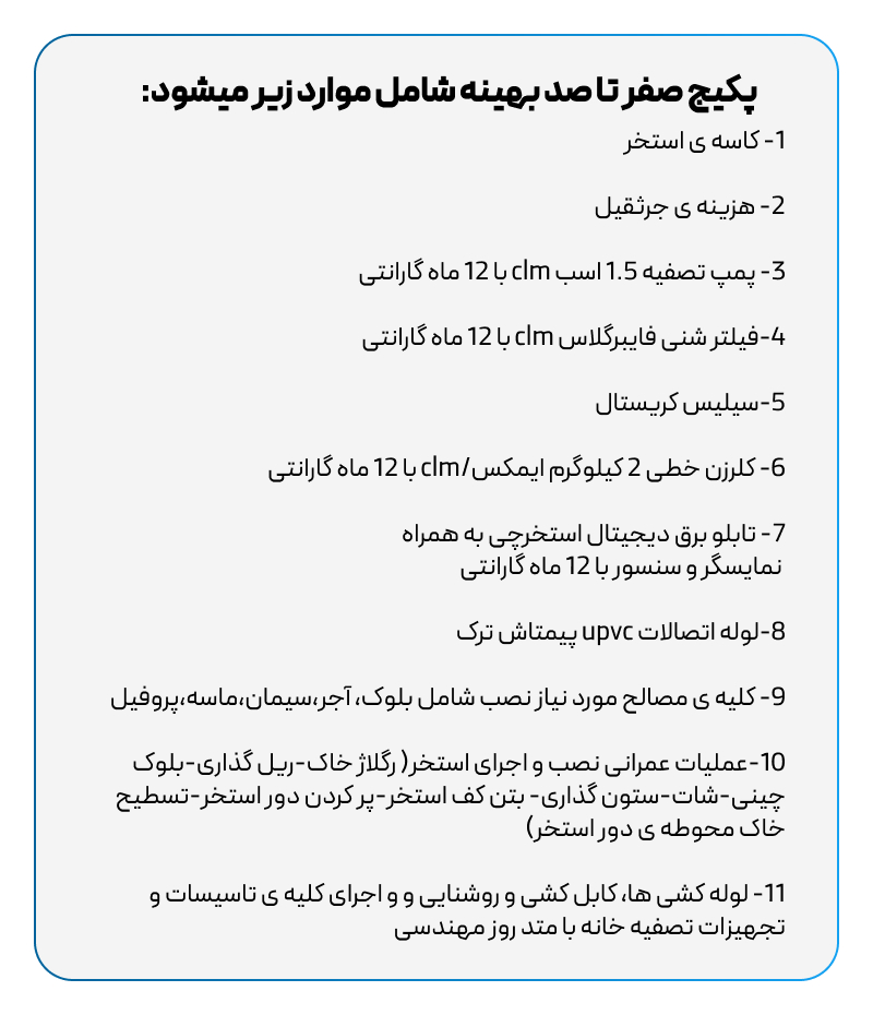 عملیات نصب سامل رگلاژ خاک، ریل گذاری، بلوک چینی، شات و ستون گذاری، بتن ریزی، پر کردن دور استخر با خاک نرم یا تثبیت شده در صورت لزوم بتن و تسطیح خاک محوطه ی دور استخر عملیات عمرانی و نصب و اجرای استخر