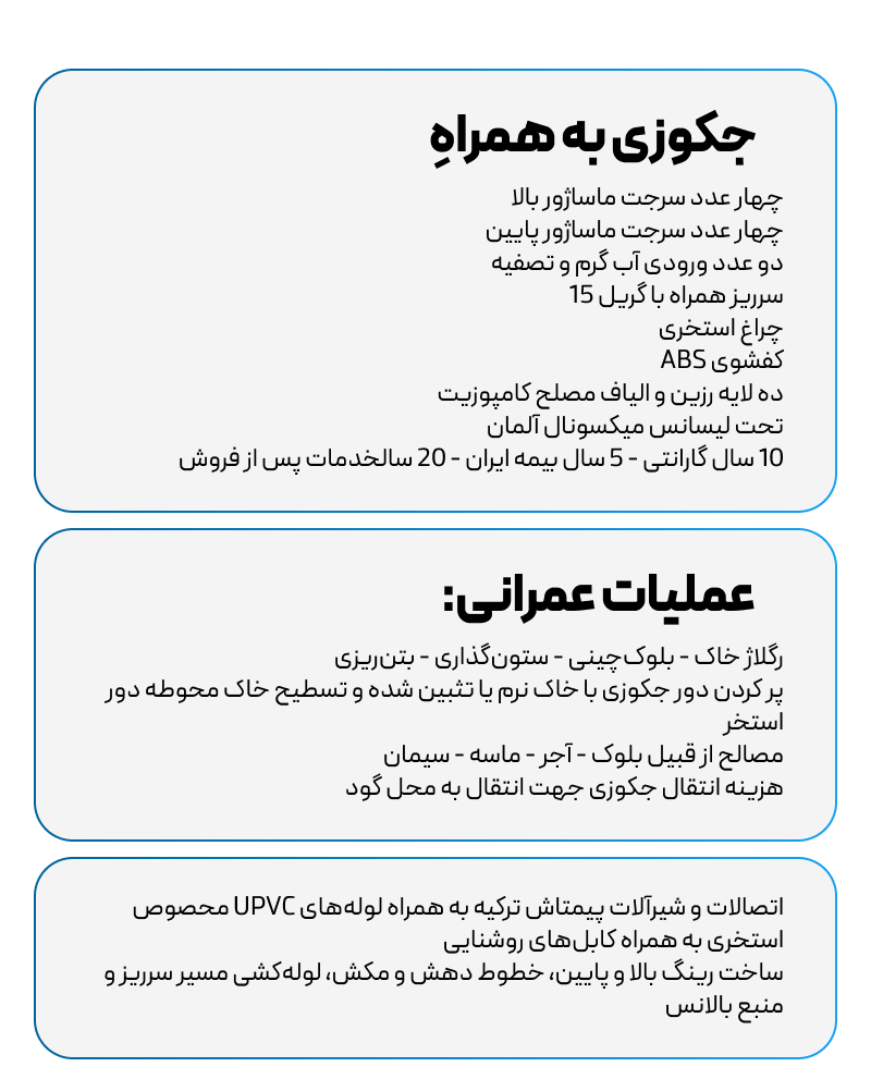 چهار عدد سرجت ماساژور بالا چهار عدد سرجت ماساژور پایین دو عدد ورودی آب گرم و تصفیه سرریز همراه با گریل 15 چراغ استخری کفشوی ABS ده لایه رزین و الیاف مصلح کامپوزیت پنج سال گارانتی و بیست سال خدمات پس از فروش